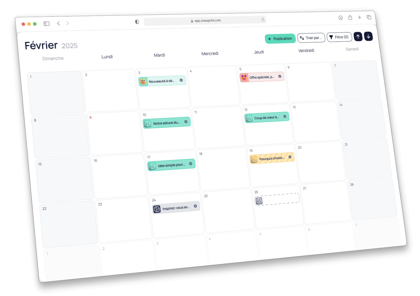 Un calendrier de publication intuitif a été développé. Il permet non seulement une navigation fluide (scroll infini) et une réorganisation simple par glisser-déposer, mais il sert aussi de tableau de bord visuel.