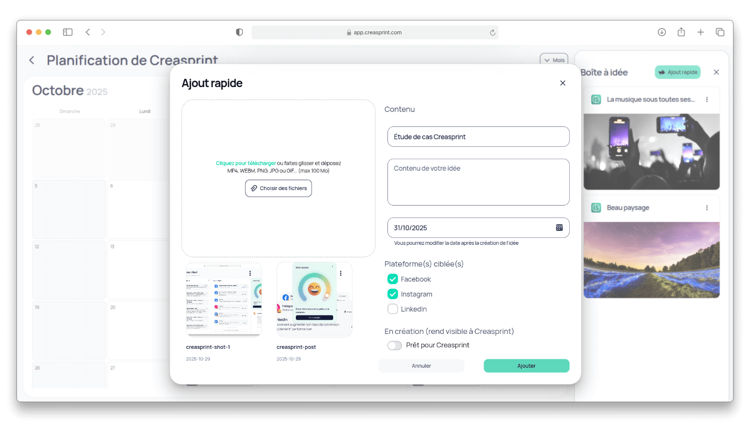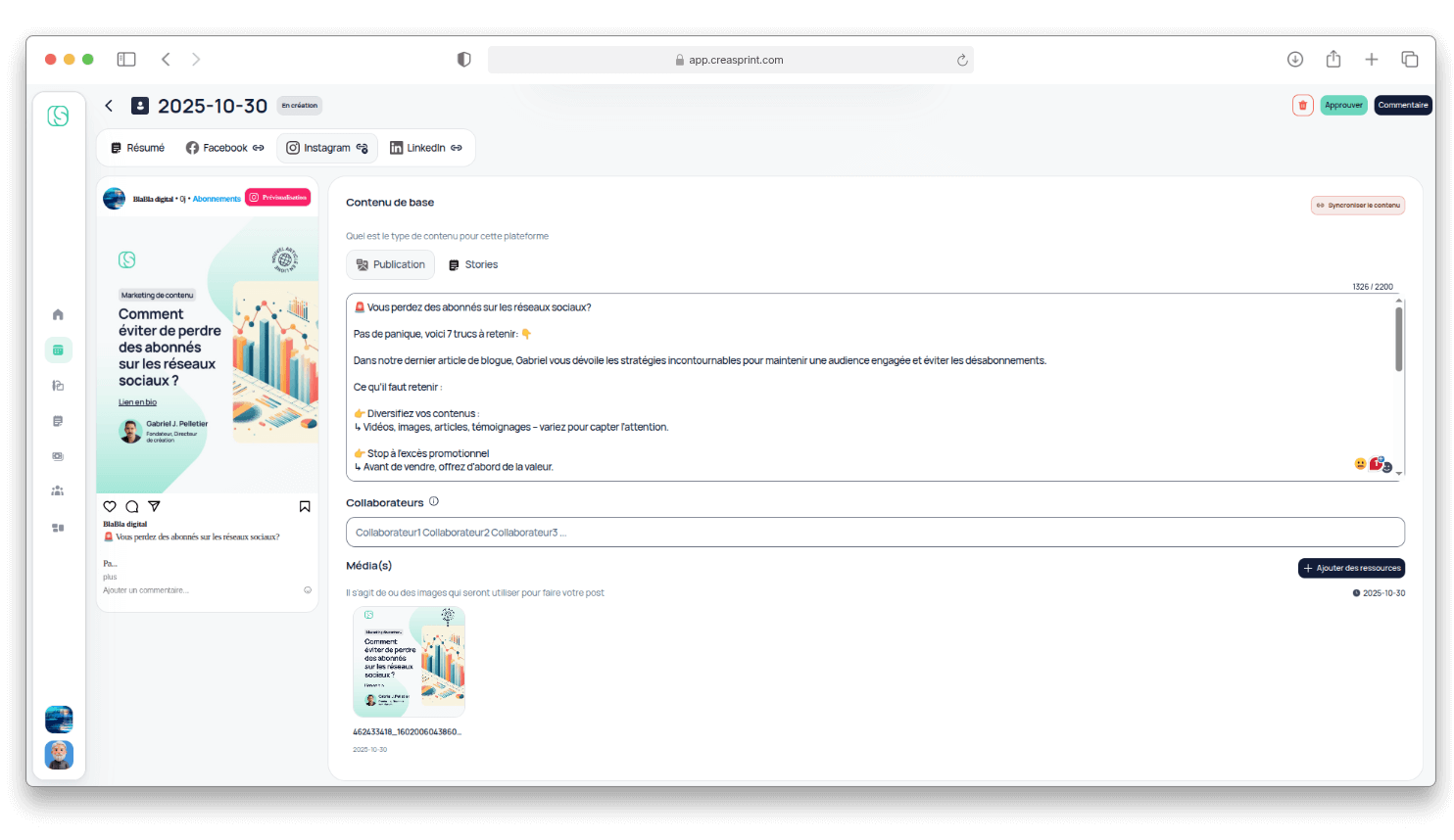 Le module de création permet de travailler en autonomie ou de collaborer avec un expert Creasprint. Il intègre une prévisualisation dynamique qui s’adapte en temps réel au réseau social choisi (Feed, Story, etc.). Une fois la date choisie et l’approbation donnée, le système gère la publication automatisée