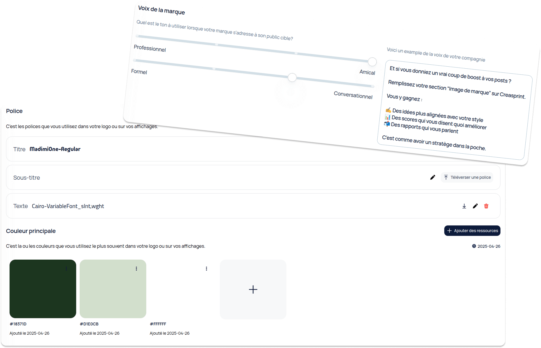 Une section centralise l’identité de marque du projet : polices, couleurs primaires et secondaires, logos, médias approuvés et même le ton à utiliser.