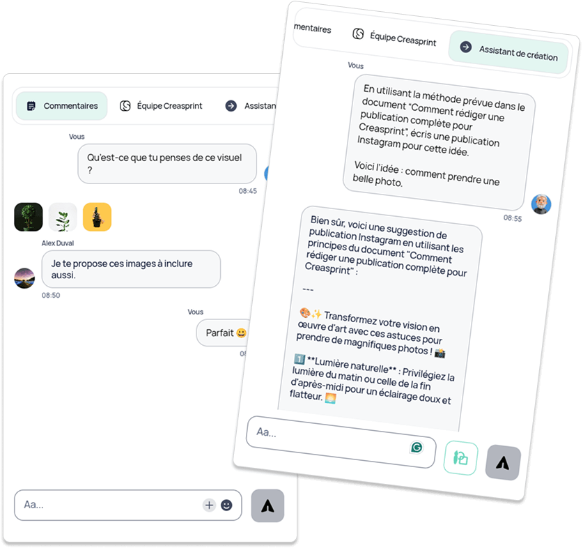 Chaque publication possède sa propre fenêtre de conversation en temps réel. Cela permet aux membres d’une même équipe de discuter ou de communiquer directement avec un expert Creasprint pour des conseils.