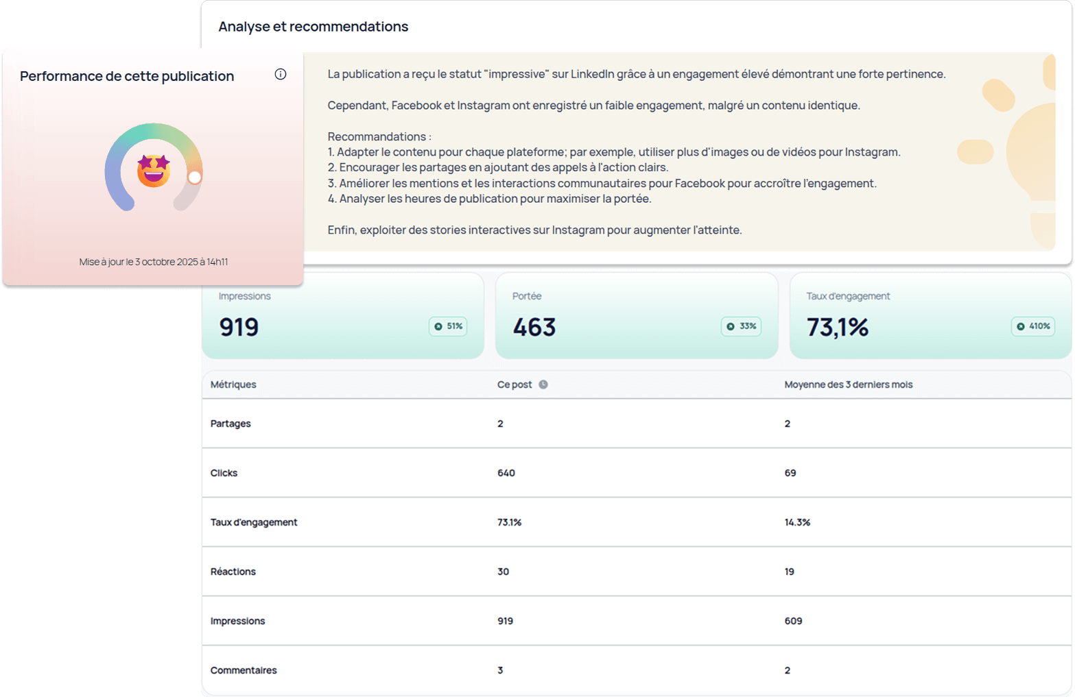 Pour chaque publication, une IA analyse les performances et fournit des recommandations claires. Des tableaux de bord dédiés affichent les métriques clés et les comparent aux publications précédentes.